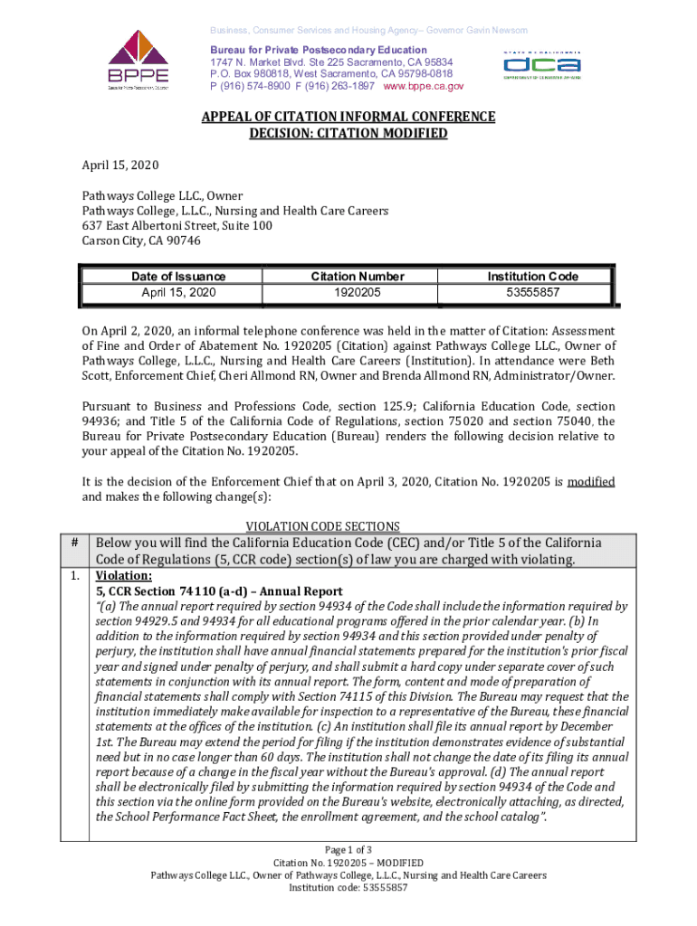 Get the free Bureau for Private Postsecondary Education - Pathways College, LLC - Appeal of Citat...