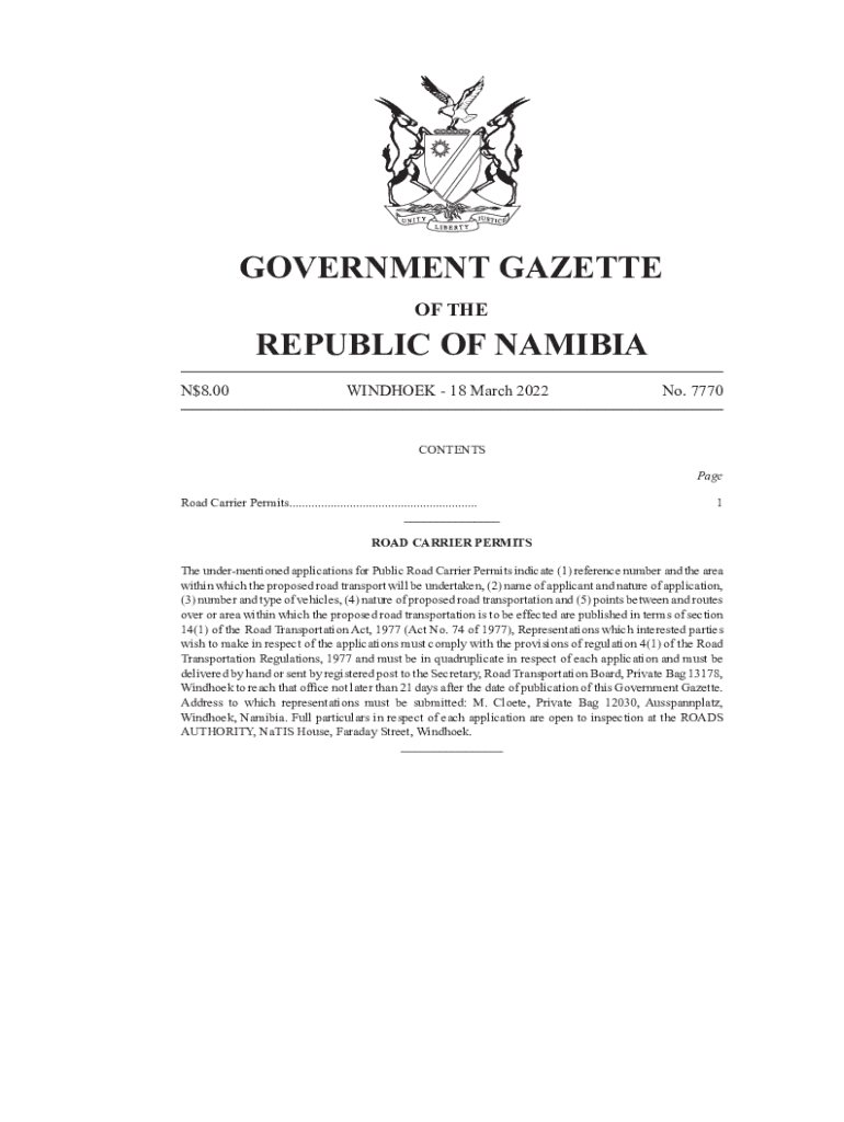 GOVERNMENT GAZETTE OF REPUBLIC OF NAMIBIA N$8.00WINDHOEK 18 March 2022No. 7770CONTENTS Page Road Carrier Permits........................................................... ___1ROAD CARRIER PERMITS