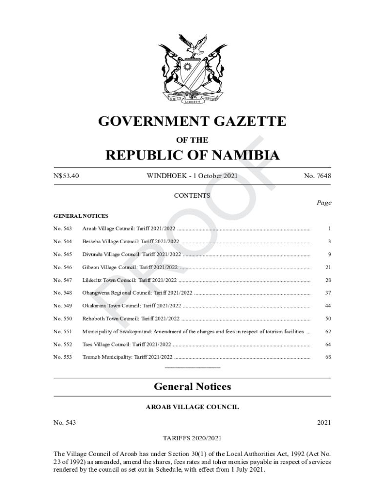 GOVERNMENT GAZETTE OF REPUBLIC OF NAMIBIA N$53.40WINDHOEK 1 October 2021CONTENTSNo. 7648PageGENERAL NOTICES No. 543Aroab Village Council: Tariff 2021/2022 ...............................................................................................1No.