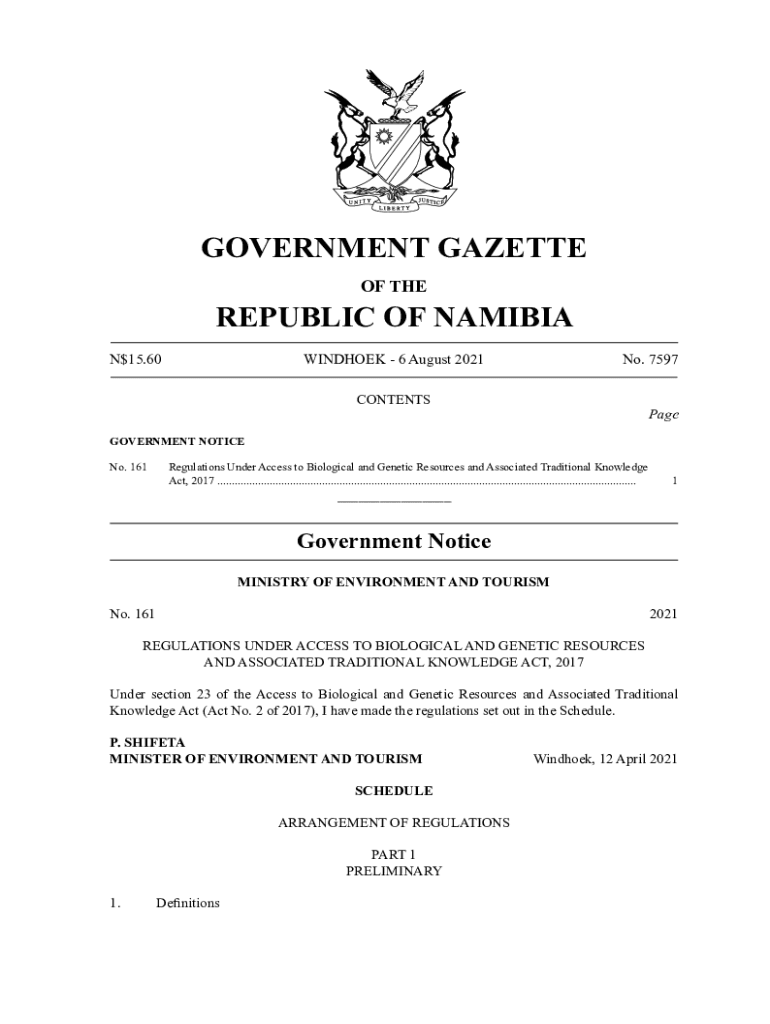 GOVERNMENT GAZETTE OF REPUBLIC OF NAMIBIA N$15.60WINDHOEK 6 August 2021No. 7597CONTENTSPageGOVERNMENT NOTICE No. 161Regulations Under Access to Biological and Genetic Resources and Associated Traditional