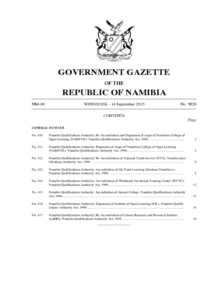 N$6.00WINDHOEK 14 September 2015CONTENTSNo. 5826PageGENERAL NOTICES