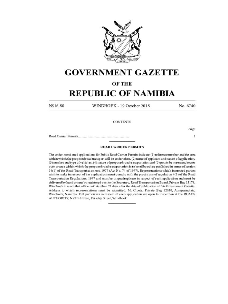 GOVERNMENT GAZETTE OF REPUBLIC OF NAMIBIA N$16.80WINDHOEK 19 October 2018No. 6740CONTENTS Page Road Carrier Permits........................................................... ___1ROAD CARRIER PERMITS