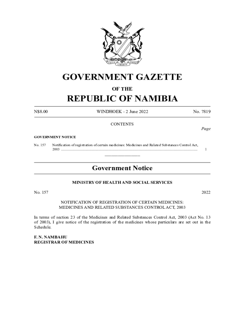 GOVERNMENT GAZETTE OF REPUBLIC OF NAMIBIA N$8.00WINDHOEK 2 June 2022CONTENTSNo. 7819PageGOVERNMENT NOTICE No. 157Notification of registration of certain medicines: Medicines and Related Substances