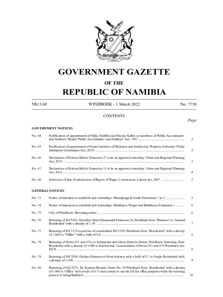 GOVERNMENT GAZETTE OF REPUBLIC OF NAMIBIA N$13.60WINDHOEK 1 March 2022No. 7758CONTENTSPageGOVERNMENT NOTICES No. 64Notification of appointment of Hilda Haiku and Naomi Kavita as members of Public
