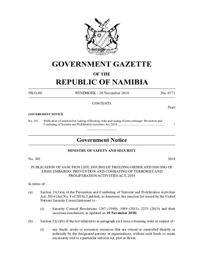 GOVERNMENT GAZETTE OF REPUBLIC OF NAMIBIA N$33.60WINDHOEK 20 November 2018CONTENTSNo. 6771PageGOVERNMENT NOTICE No. 302Publication of sanction list; issuing of freezing order and issuing of arms embargo: