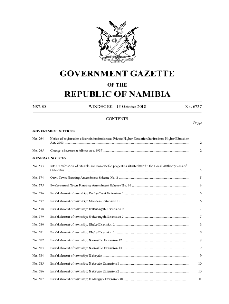 GOVERNMENT GAZETTE OF REPUBLIC OF NAMIBIA N$7.80WINDHOEK 15 October 2018 No. 6737 CONTENTSPageGOVERNMENT NOTICES No. 264Notice of registration of certain institutions as Private Higher Education Institutions: