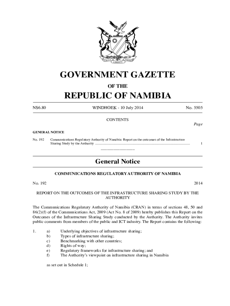 GOVERNMENT GAZETTE OF REPUBLIC OF NAMIBIA N$6.80WINDHOEK 10 July 2014No. 5505CONTENTSPageGeneral NOTICE No. 192Communications Regulatory Authority of Namibia: Report on the outcomes of the Infrastructure