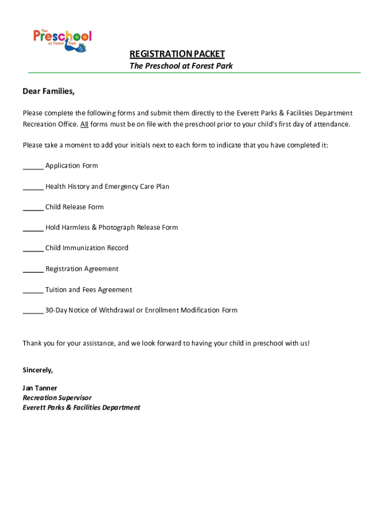 REGISTRATION PACKET The Preschool at Forest Park Dear Families, Please complete the following forms and submit them directly to the Everett Parks & Facilities Department Recreation Office. All forms