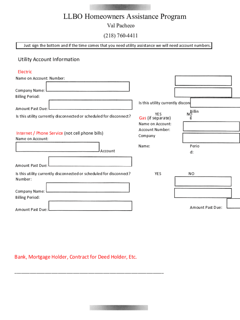 LBO Homeowners Assistance Program Val Pacheco (218) 7604411 Just sign the bottom and if the time comes that you need utility assistance we will need account numbers. Utility Account Information Electric