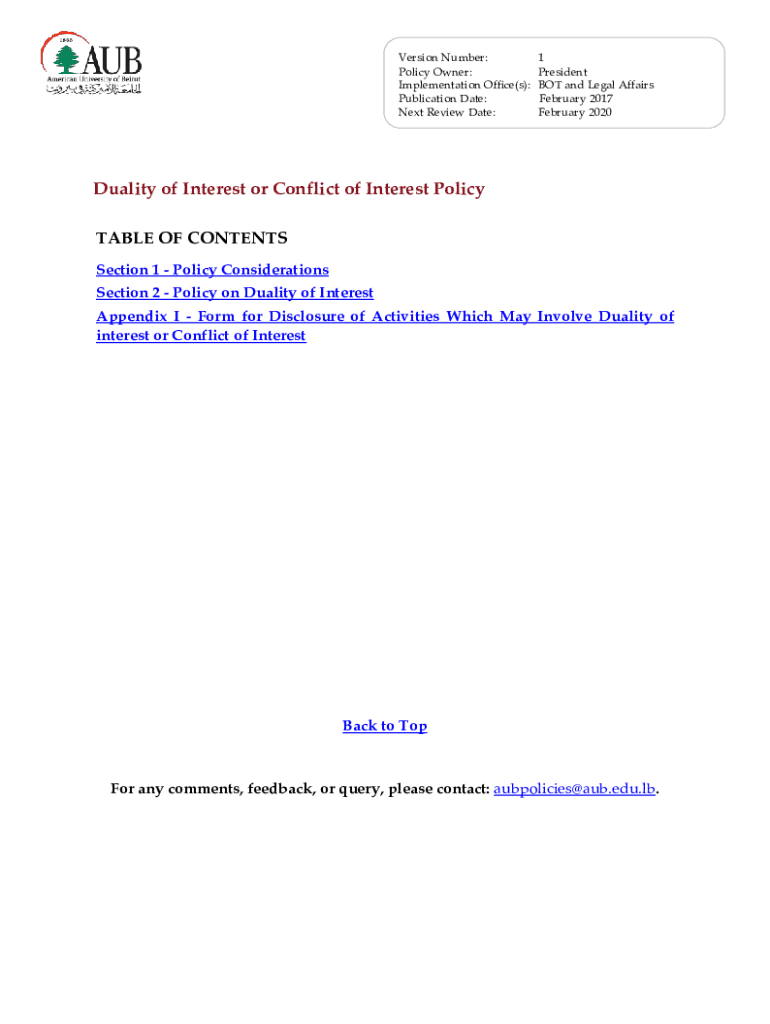 Version Number: Policy Owner: Implementation Office(s): Publication Date: Next Review Date:1 President BOT and Legal Affairs February 2017 February 2020Duality of Interest or Conflict of Interest
