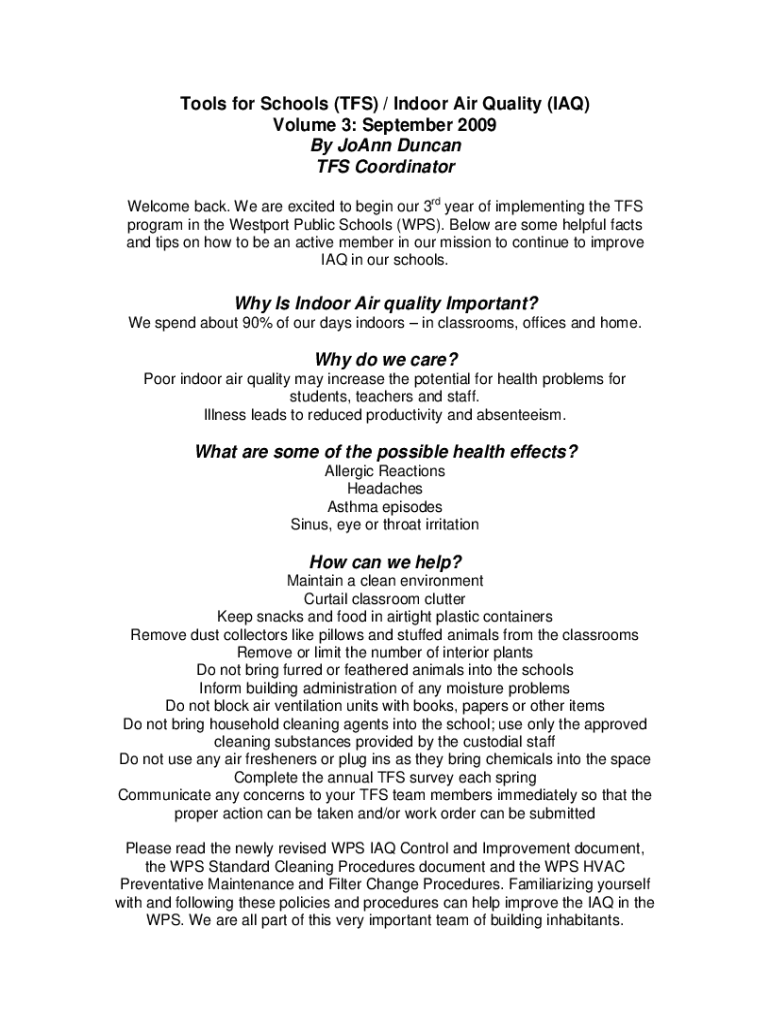 Tools for Schools (TFS) / Indoor Air Quality (IRAQ) Volume 3: September 2009 By Joann Duncan TFS Coordinator Welcome back. We are excited to begin our 3rd year of implementing the TFS program in the