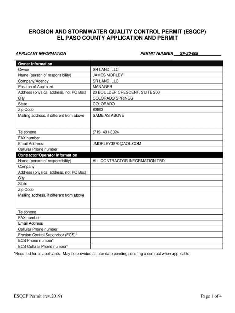 EROSION AND STORMWATER QUALITY CONTROL PERMIT (ESP) EL PASO COUNTY APPLICATION AND PERMIT APPLICANT INFORMATION Owner Name (person of responsibility) Company/Agency Position of Applicant Address (physical