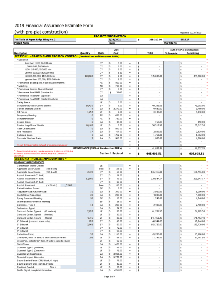 2019 Financial Assurance Estimate Form (with prep lat construction) The Trails at Aspen Ridge Filing No. 2Updated: 02/28/2020PROJECT INFORMATION 2/26/2021Project Name$DateUnit Quantity Units Cost