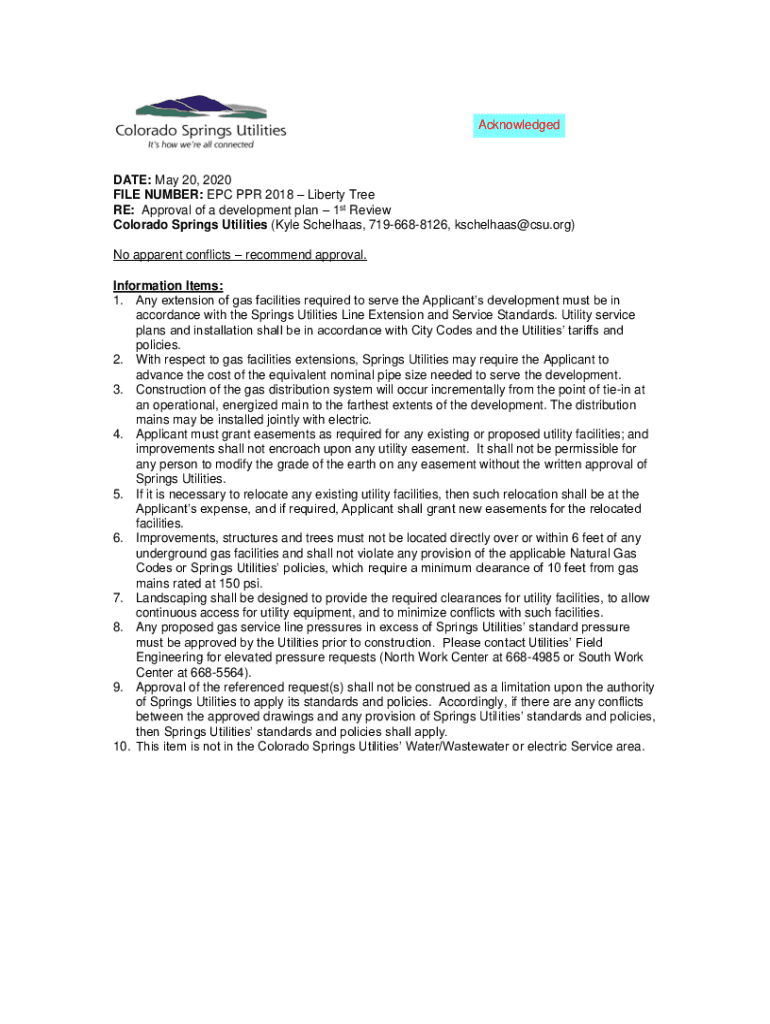 AcknowledgedDATE: May 20, 2020, FILE NUMBER: EPC PPR 2018 Liberty Tree RE: Approval of a development plan 1st Review Colorado Springs Utilities (Kyle Scholars, 7196688126, kschelhaas@csu.org) No apparent