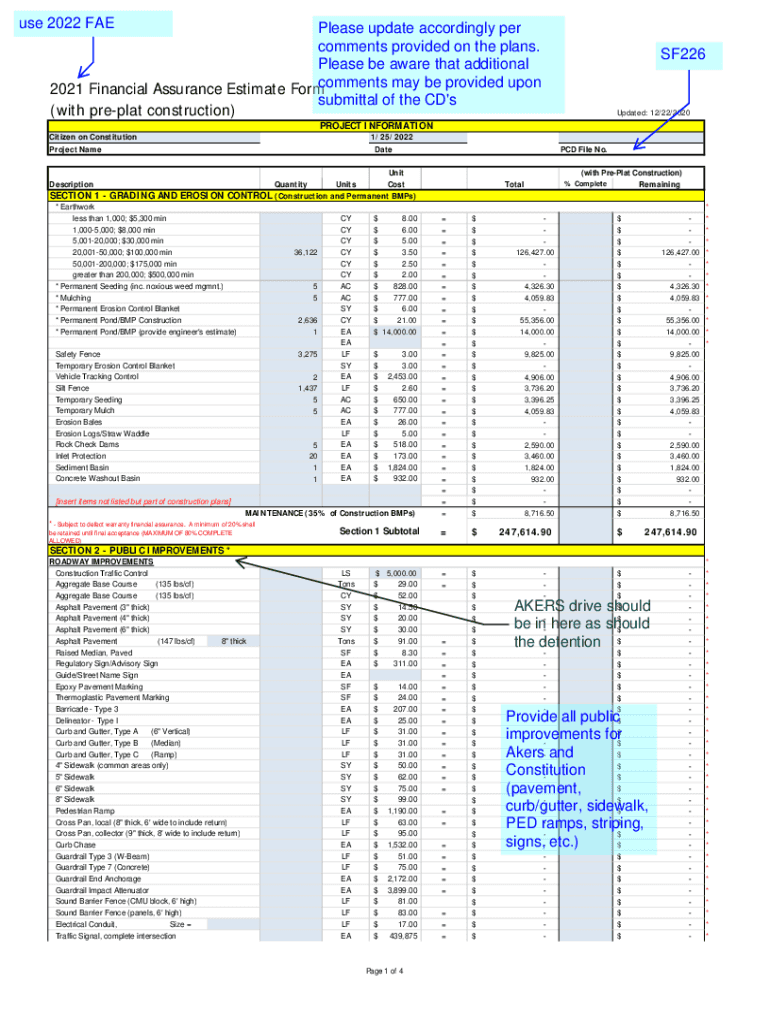 Use 2022 Release update accordingly per comments provided on the plans. Please be aware that additional 2021 Financial Assurance Estimate Form comments may be provided upon submittal of the CD\'s