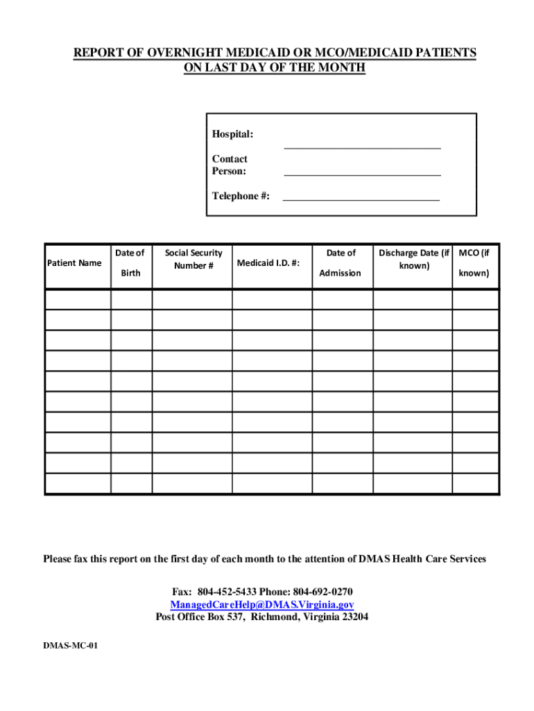 REPORT OF OVERNIGHT MEDICAID OR MCO/MEDICAID PATIENTS