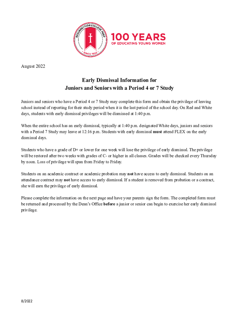 August 2022Early Dismissal Information for Juniors and Seniors with a Period 4 or 7 Study Juniors and seniors who have a Period 4 or 7 Study may complete this form and obtain the privilege of leaving