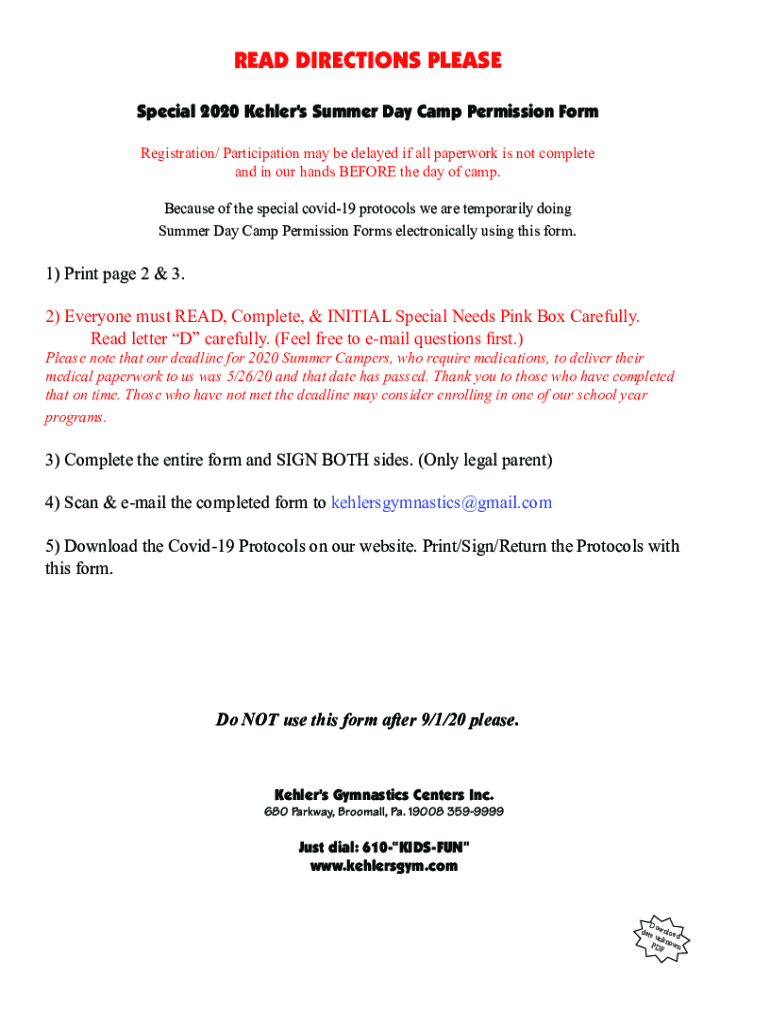 READ DIRECTIONS PLEASE Special 2020 Dealers Summer Day Camp Permission Form Registration/ Participation may be delayed if all paperwork is not complete and in our hands BEFORE the day of camp. Because