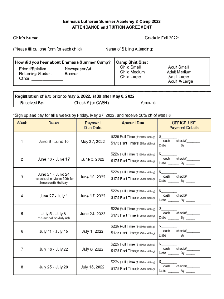 Emma us Lutheran Summer Academy & Camp 2022 ATTENDANCE and TUITION AGREEMENT Child's Name: ___ (Please fill out one form for each child)Grade in Fall 2022: ___Name of Sibling Attending: ___How did