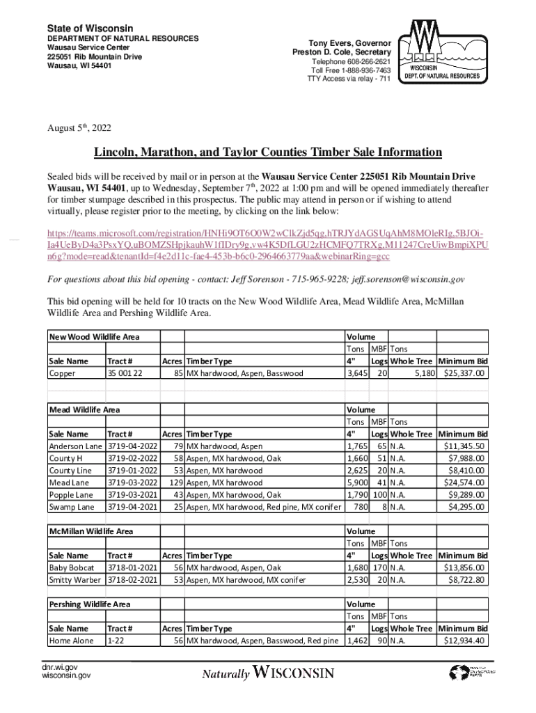 Get the free Lincoln, Marathon, and Taylor County Timber Sales - September 7 ... - dnr wisconsin