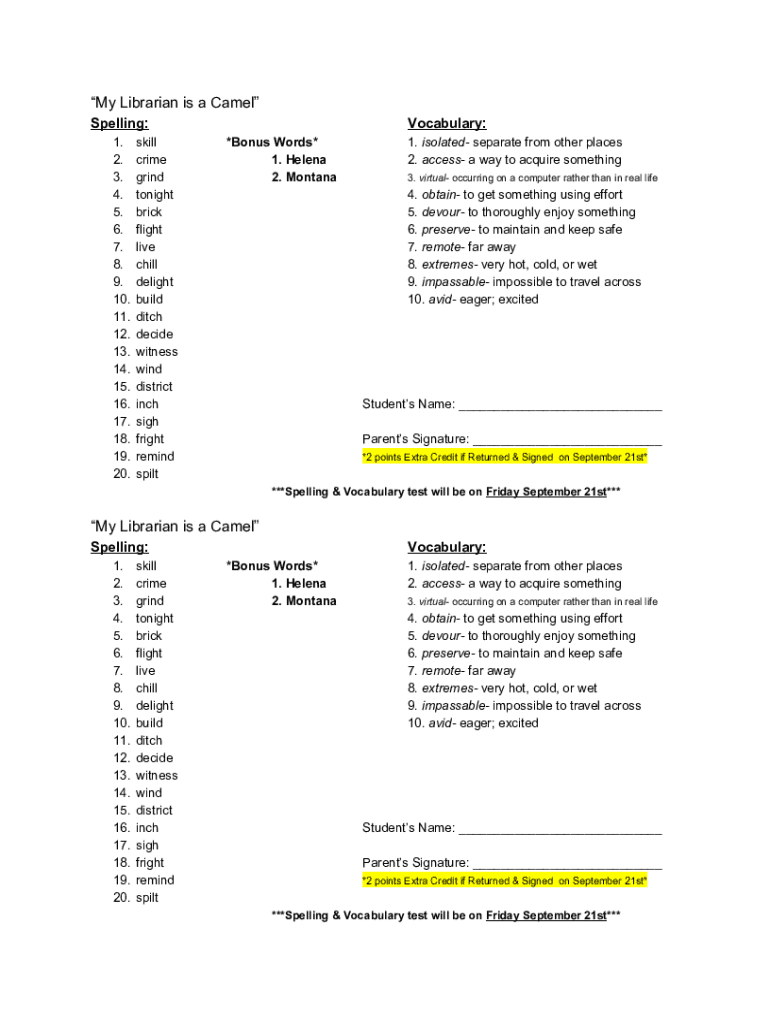 My Librarian is a Camel Spelling: 1. 2. 3. 4. 5. 6. 7. 8. 9. 10. 11. 12. 13. 14. 15. 16. 17. 18. 19. 20.skill crime grind tonight brick flight live chill delight build ditch decide witness wind district