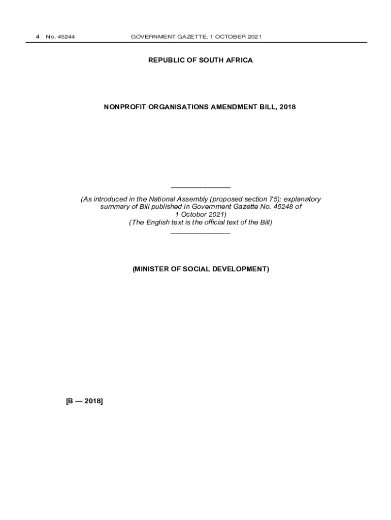 4No. 45244GOVERNMENT GAZETTE, 1 October 2021REPUBLIC OF SOUTH AFRICANONPROFIT Organizations AMENDMENT BILL, 2018___ (As introduced in the National Assembly (proposed section 75); explanatory summary