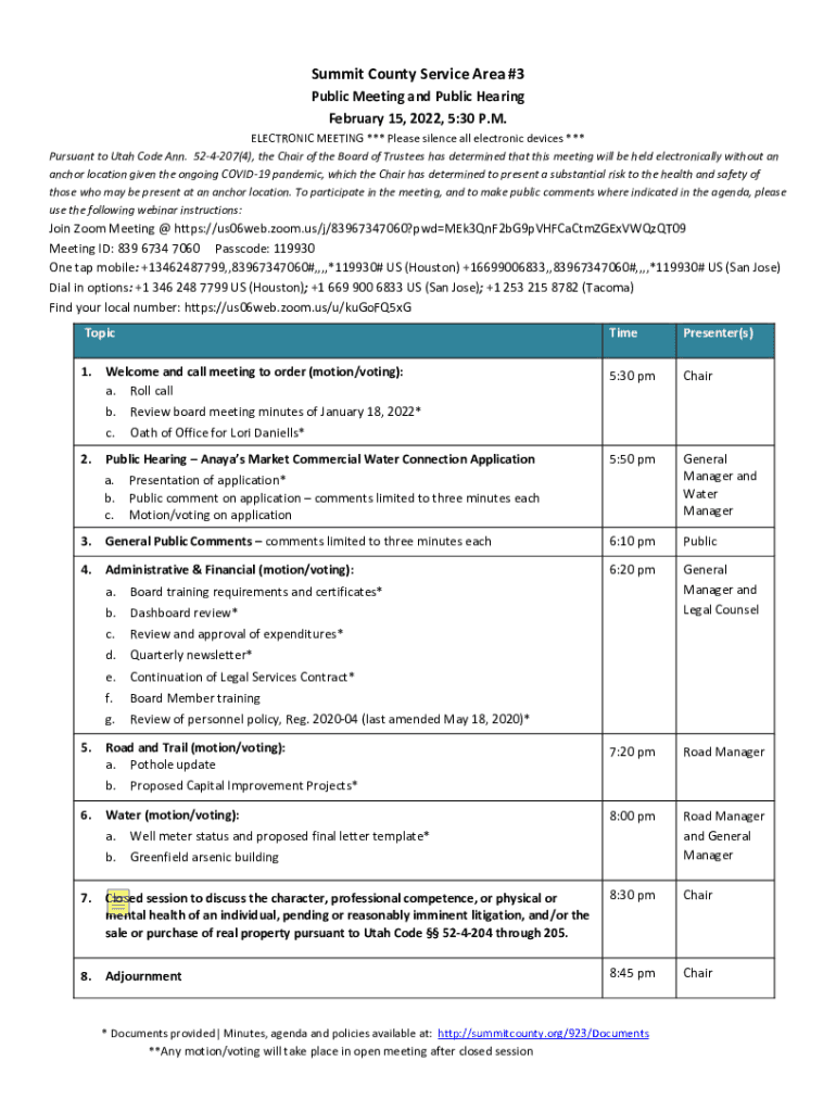 Summit County Service Area #3 Public Meeting and Public Hearing February 15, 2022, 5:30 P.M. ELECTRONIC MEETING *** Please silence all electronic devices *** Pursuant to Utah Code Ann. 524207(4),