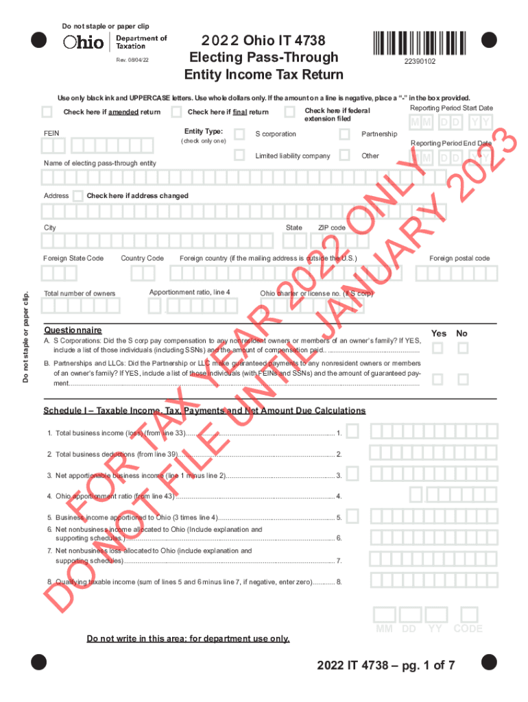 Do not staple or paper clip2022 Ohio IT 4738Electing Walkthrough Entity Income Tax Return Rev. 08/04/2222390102Use only black ink and UPPERCASE letters. Use whole dollars only. If the amount on a