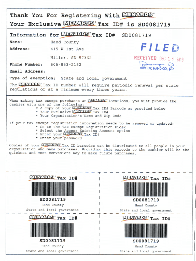 Thank You For RegisteringwithryYour Exclusive 3 ran ID# is SDOO817L Information for jlEEefrtFa\'Tax ID# SD00B17tg Name:Hand CountyAddrees:41,5 WFILEffiLst Ave Miller, SD 57352RECEIVIB SIC 1 its* l