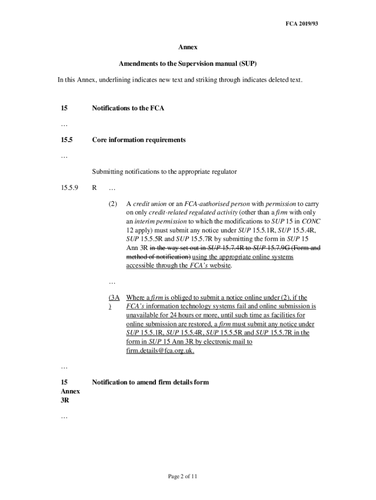 FCA 2019/93Annex Amendments to the Supervision manual (SUP) In this Annex, underlining indicates new text and striking through indicates deleted text.15Notifications to the FCA 15.5Core information