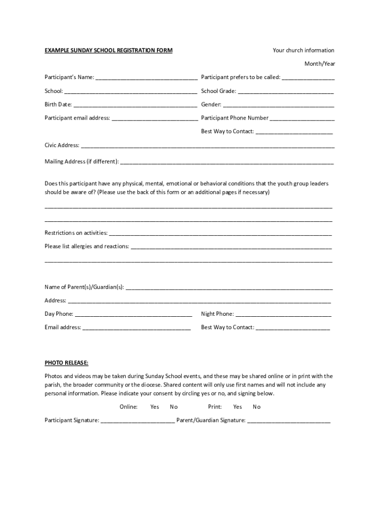 EXAMPLE SUNDAY SCHOOL REGISTRATION Former church information Month/YearParticipants Name: ___ Participant prefers to be called: ___ School: ___ School Grade: ___ Birth Date: ___ Gender: ___ Participant