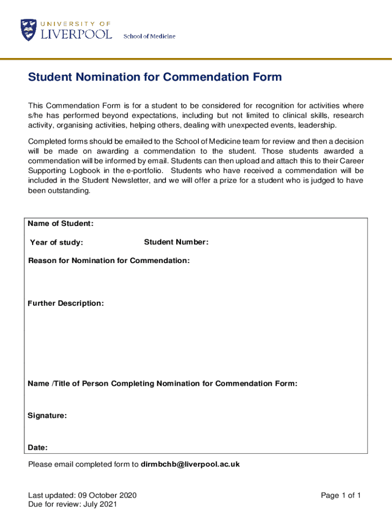 Student Nomination for Commendation Form This Commendation Form is for a student to be considered for recognition for activities where s/he has performed beyond expectations, including but not limited
