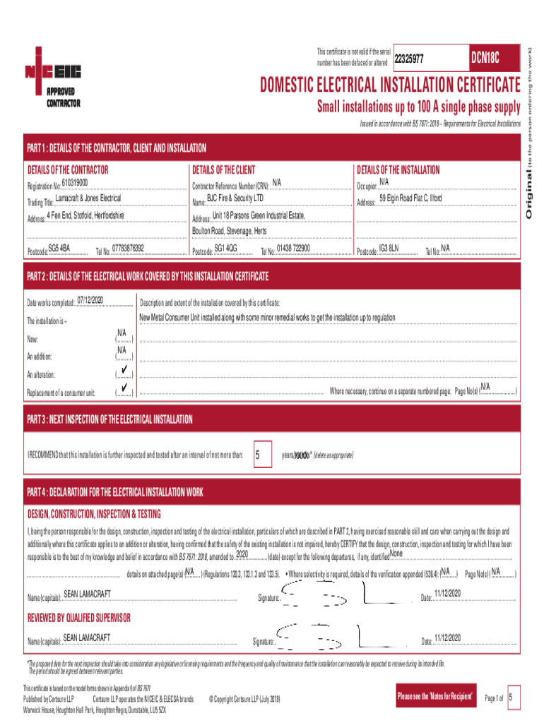 DCN18C22325977DOMESTIC ELECTRICAL INSTALLATION CERTIFICATE