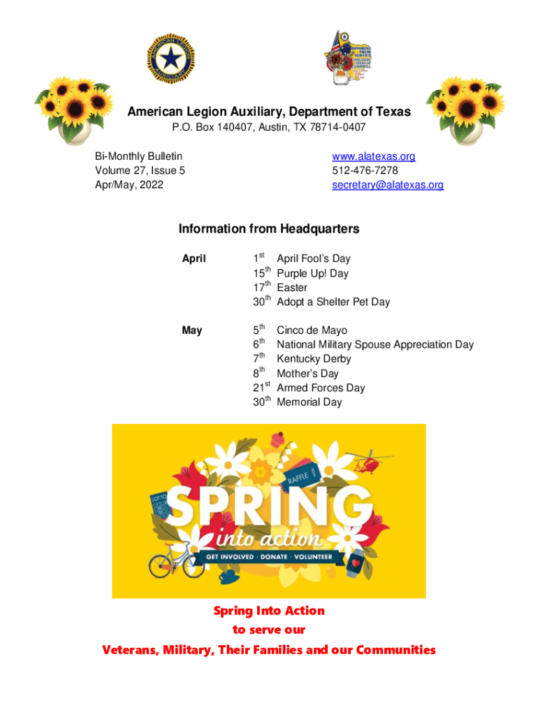 American Legion Auxiliary, Department of Texas P.O. Box 140407, Austin, TX 787140407 Bimonthly Bulletin Volume 27, Issue 5 Apr/May, 2022www.Alexas.org 5124767278 secretary@alatexas.orgInformation