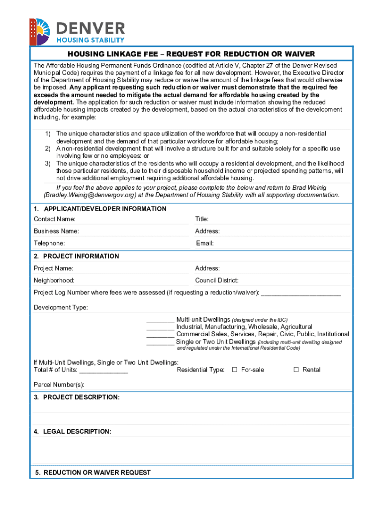 HOUSING LINKAGE FEE REQUEST FOR REDUCTION OR WAIVER The Affordable Housing Permanent Funds Ordinance (codified at Article V, Chapter 27 of the Denver Revised Municipal Code) requires the payment of