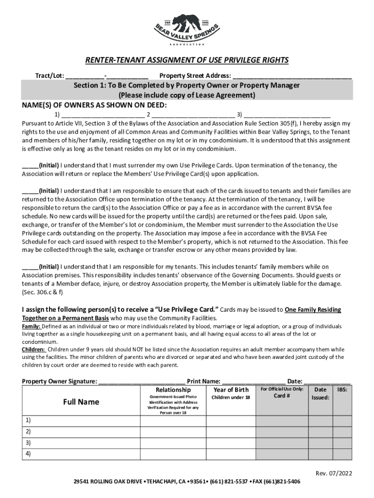 RENTERTENANT ASSIGNMENT OF USE PRIVILEGE RIGHTS Tract/Lot: ______Property Street Address: ___Section 1: To Be Completed by Property Owner or Property Manager (Please include copy of Lease Agreement)