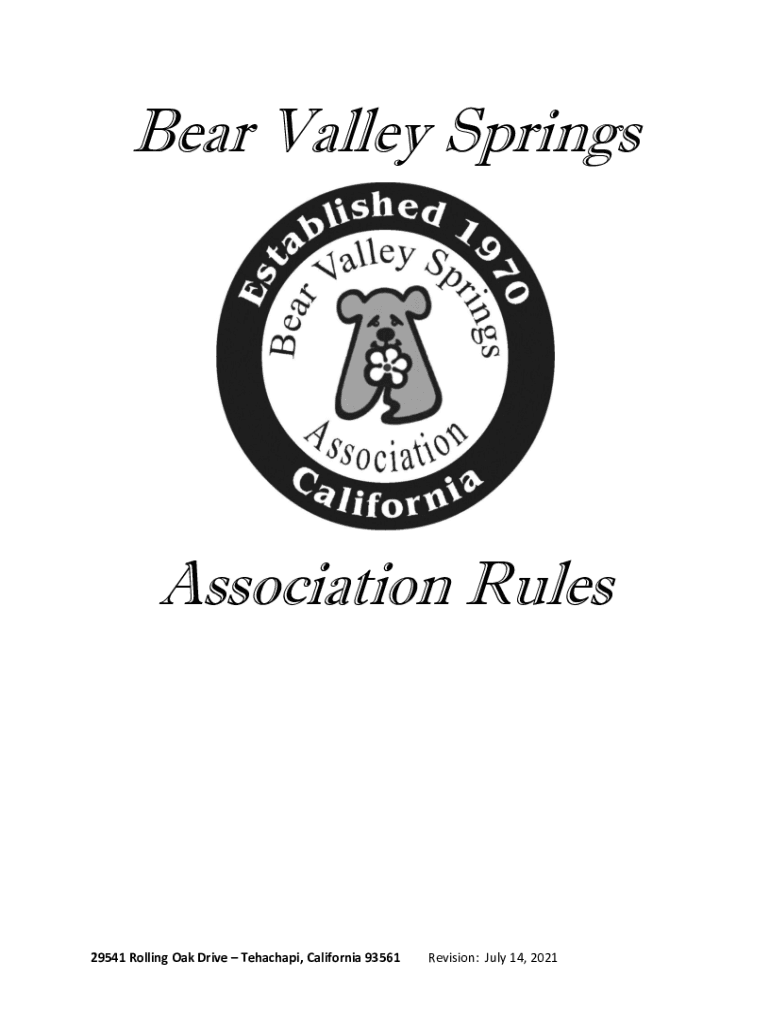 Bear Valley SpringsAssociation Rules29541 Rolling Oak Drive Tehachapi, California 93561Revision: July 14, 2021RESTATED COVENANTS, CONDITIONS AND RESTRICTIONS FOR Bear Valley Springs Association January
