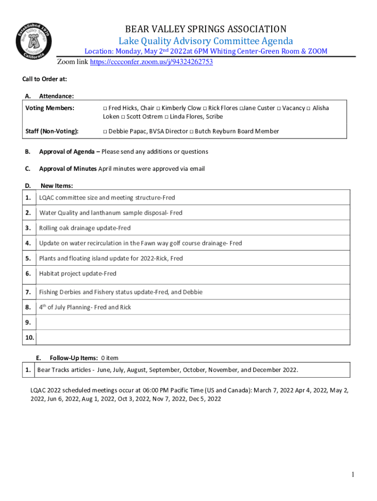 BEAR VALLEY SPRINGS ASSOCIATION Lake Quality Advisory Committee Agenda Location: Monday, May 2nd 2022at 6PM Whiting Center Green Room & ZOOM link https://cccconfer.zoom.us/j/94324262753 Call to Order