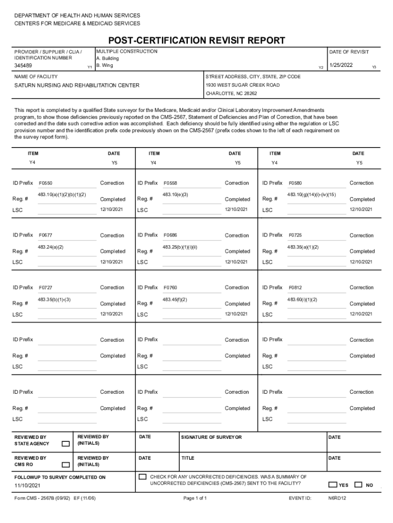 DEPARTMENT OF HEALTH AND HUMAN SERVICES CENTERS FOR MEDICARE & MEDICAID SERVICESPOSTCERTIFICATION REVISIT REPORT PROVIDER / SUPPLIER / CIA / IDENTIFICATION NUMBER345489Y1MULTIPLE CONSTRUCTION A. Building