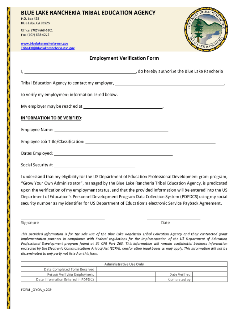 BLUE LAKE RANCHER IA TRIBAL EDUCATION AGENCY P.O. Box 428 Blue Lake, CA 95525Office: (707) 6685101 Fax: (707) 6684272 www.bluelakerancheriansn.gov TribalEd@bluelakerancheriansn.govEmployment Verification