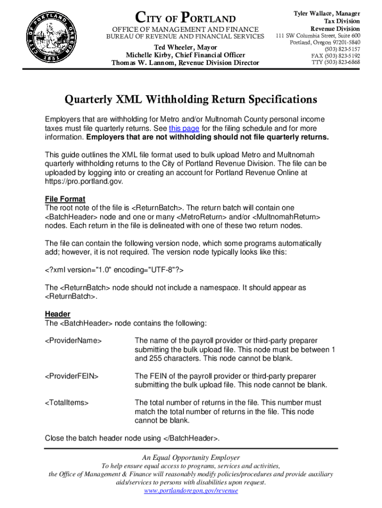 CITY OF PORTLANDOFFICE OF MANAGEMENT AND FINANCEBUREAU OF REVENUE AND FINANCIAL SERVICES Ted Wheeler, Mayor Michelle Kirby, Chief Financial Officer Thomas W. Cannot, Revenue Division Director Tyler