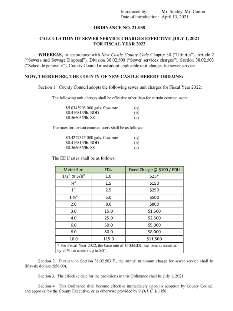 Introduced by: Mr. Smiley, Mr. Cartier Date of introduction: April 13, 2021, ORDINANCE NO. 21038 CALCULATION OF SEWER SERVICE CHARGES EFFECTIVE JULY 1, 2021, FOR FISCAL YEAR 2022 WHEREAS, in accordance