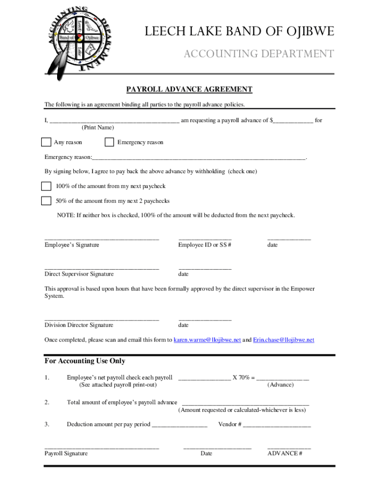 LEECH LAKE BAND OF OJIBWA ACCOUNTING DEPARTMENT PAYROLL ADVANCE AGREEMENT The following is an agreement binding all parties to the payroll advance policies. I, ___ am I requesting a payroll advance