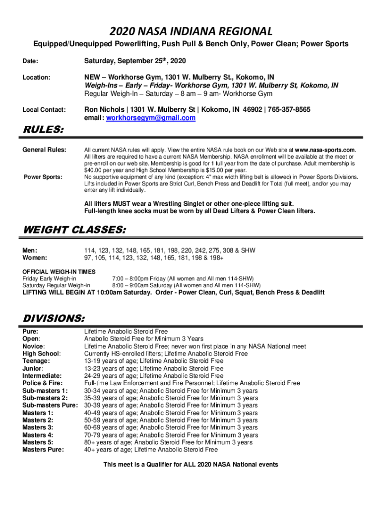 2020 NASA INDIANA REGIONAL Equipped/Unequipped Powerlifting, Push Pull & Bench Only, Power Clean; Power Sports Date:Saturday, September 25th, 2020Location:NEW Workhorse Gym, 1301 W. Mulberry St.,