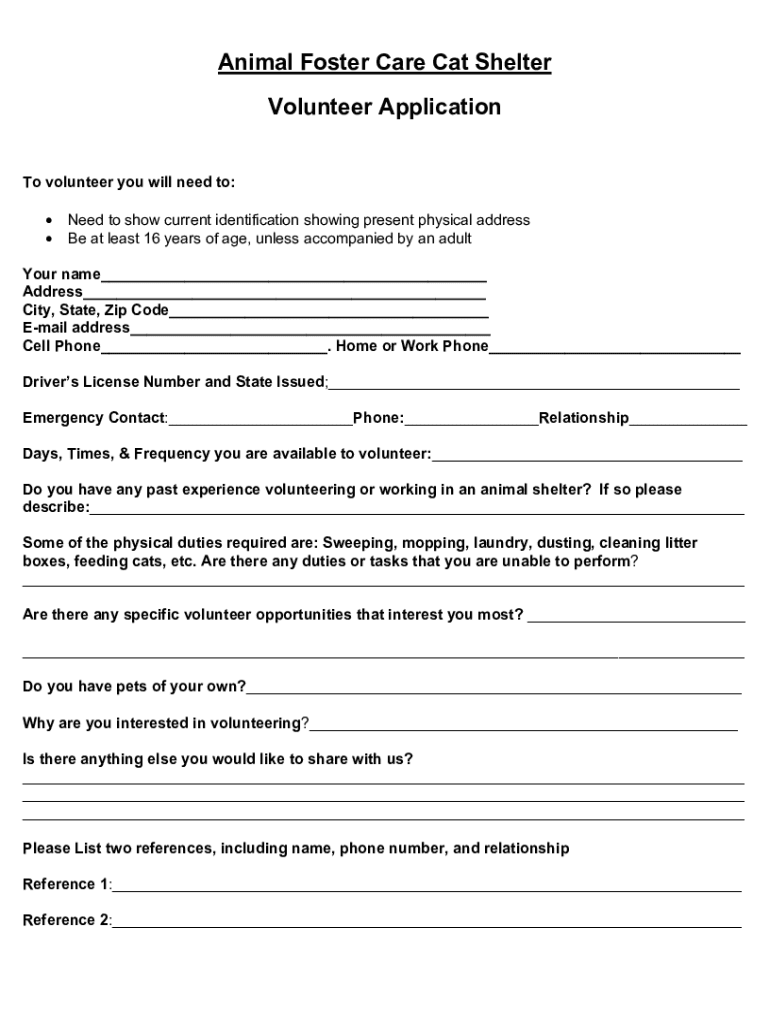 Animal Foster Care Cat Shelter Volunteer Application To volunteer you will need to: Need to show current identification showing present physical address Be at least 16 years of age, unless accompanied