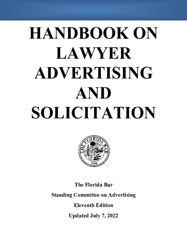 HANDBOOK ON LAWYER ADVERTISING AND Solicitation Florida Bar Standing Committee on Advertising Eleventh Edition Updated July 7, 2022TABLE OF CONTENTS INTRODUCTION ......................................................................................................................