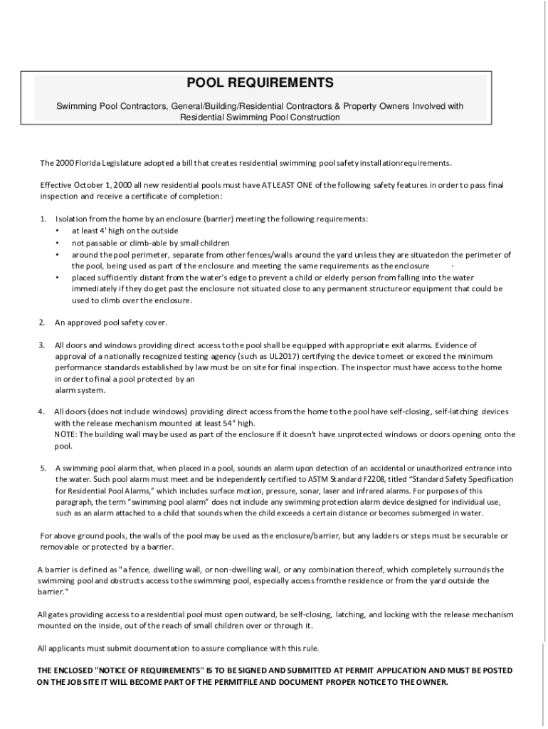 POOL REQUIREMENTS Swimming Pool Contractors, General/Building/Residential Contractors & Property Owners Involved with Residential Swimming Pool Construction 2000 Florida Legislature adopted a bill