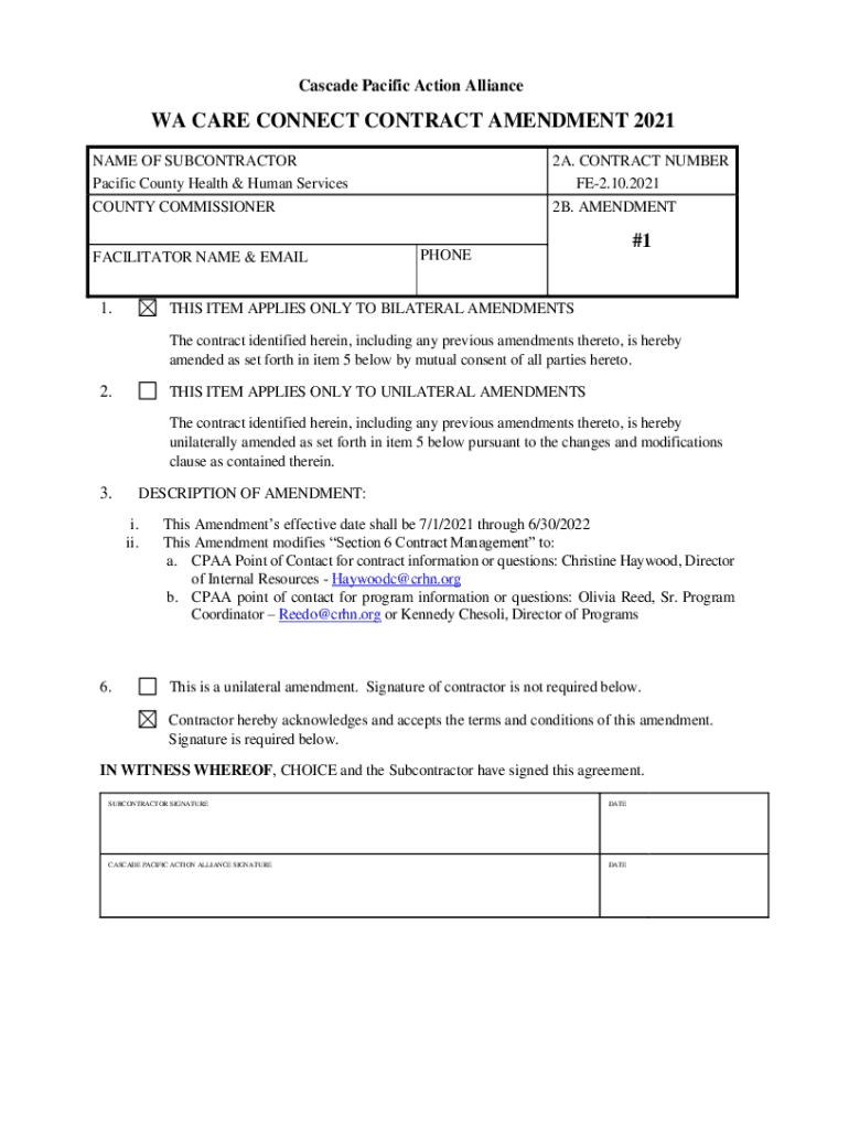 Cascade Pacific Action Alliance WA CARE CONNECT CONTRACT AMENDMENT 2021 NAME OF SUBCONTRACTOR Pacific County Health & Human Services2A. CONTRACT NUMBER FE2.10.2021COUNTY COMMISSIONER2B. AMENDMENTFACILITATOR