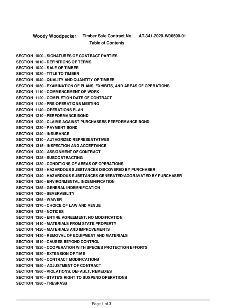 Woody WoodpeckerTimber Sale Contract No.AT3412020W0059001Table of Contents SECTION 1000 SIGNATURES OF CONTRACT PARTIES SECTION 1010 DEFINITIONS OF TERMS SECTION 1020 SALE OF TIMBER SECTION 1030 TITLE