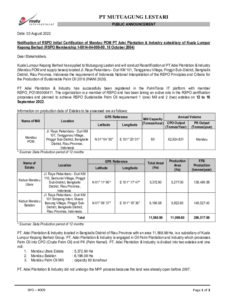 PT MUTATING LEST ARI PUBLIC ANNOUNCEMENT Date: 03 August 2022 Notification of RPO Initial Certification of Landau POM PT Ada Plantation & Industry subsidiary of Kuala Lumpur Keeping Broad (RPO Membership